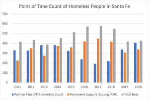 The annual ‘point in time’ count for January 2020 showed that there were 407 homeless people in Santa Fe on a single night in January. This is an increase over previous years and continues an upward trend that started in 2018. At the same time, 428 formerly homeless people were living in supportive housing designated for people exiting homelessness. Of these, 340 were living in permanent supportive housing for people with disabilities and 88 were living in transitional housing or rapid rehousing for people without disabilities.