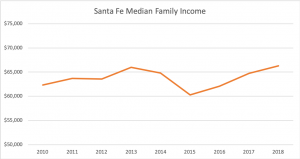The best gauge of local incomes is the Census Median Family Income, as this most closely approximates incomes used to support housing payments. As we can see below, Median Family Income over the last 10 years has remained relatively flat for the urbanized area of Santa Fe.