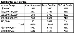 However, the pandemic has created a very precarious situation that points to a high risk for future homelessness in the coming year. Prior to the pandemic there were over 5700 renter families earning less than $50,000 a year that were already paying unaffordable rents. And while there are eviction moratoria in place at both the State and Federal level, families are still responsible for repaying any unpaid rent. This suggests a large anticipated need for additional local rental housing assistance programs.