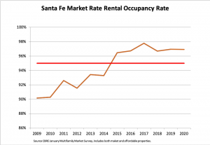 The best indicator for overall rental market conditions is the unit vacancy rate. The commercial real estate firm CBRE produces periodic rental housing surveys that poll rental and vacancy rates in around 20 multi-family properties with just over 3500 units of both affordable and market rate units. The January 2020 report indicates the overall occupancy rate of 97.67%, with anything over 95% considered a supply-constrained market. The survey also found that year-over-year rent growth was 7.6%. Affordable properties showed an astounding 98.6% occupancy, which is functionally at 100% occupancy, as the vacant units expressed in the survey are usually in the process of turning over to a new renter family. Waiting lists for affordable housing echo these findings in that there is extremely high demand for existing income-restricted multi-family units with the Housing Trust reporting over 400 families on waiting lists for their three affordable rental developments. The Santa Fe Civic Housing Authority lists have been closed for approximately two years, but still report more than 200 people waiting for housing at family sites and over 300 on lists for senior serving projects, which represent a 4-5 year wait for housing.